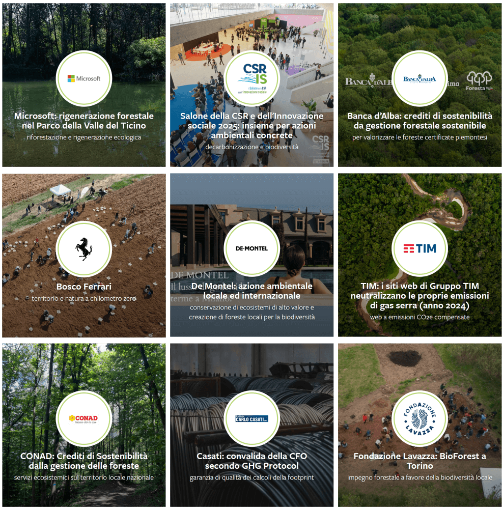 Si tratta o di Progetti esteri, anche finalizzati a compensare la CO2 di prodotti/servizi e di Organizzazioni con crediti di carbonio generati tramite tutela e riqualificazione di ecosistemi fragili, o di Progetti italiani rivolti ad incrementare e migliorare il capitale naturale italiano, a stoccare carbonio nei suoli e soprassuoli agricoli ("carbon farming"), a tutelare la biodiversità, a sostanziare la Nature Positive® Strategy delle Aziende.